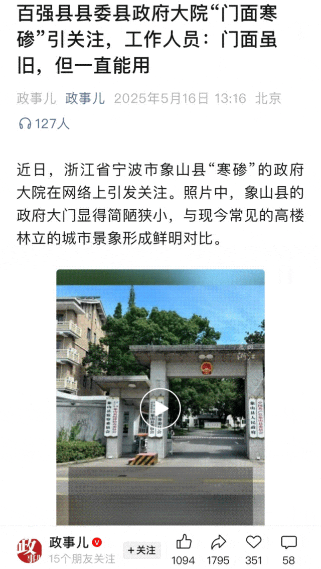 5月中旬,象山县大院“寒碜”门面相关报道,激发多量网友围不雅,、工人日报、人平易近网、网等地方级纷纷跟进解读评论,相关话题登上多项全国热搜,点击量上亿。“千年旧址苦守+全国百强县实力”的强烈反差,让象山政务务实、平易近生为先的抽象深切。